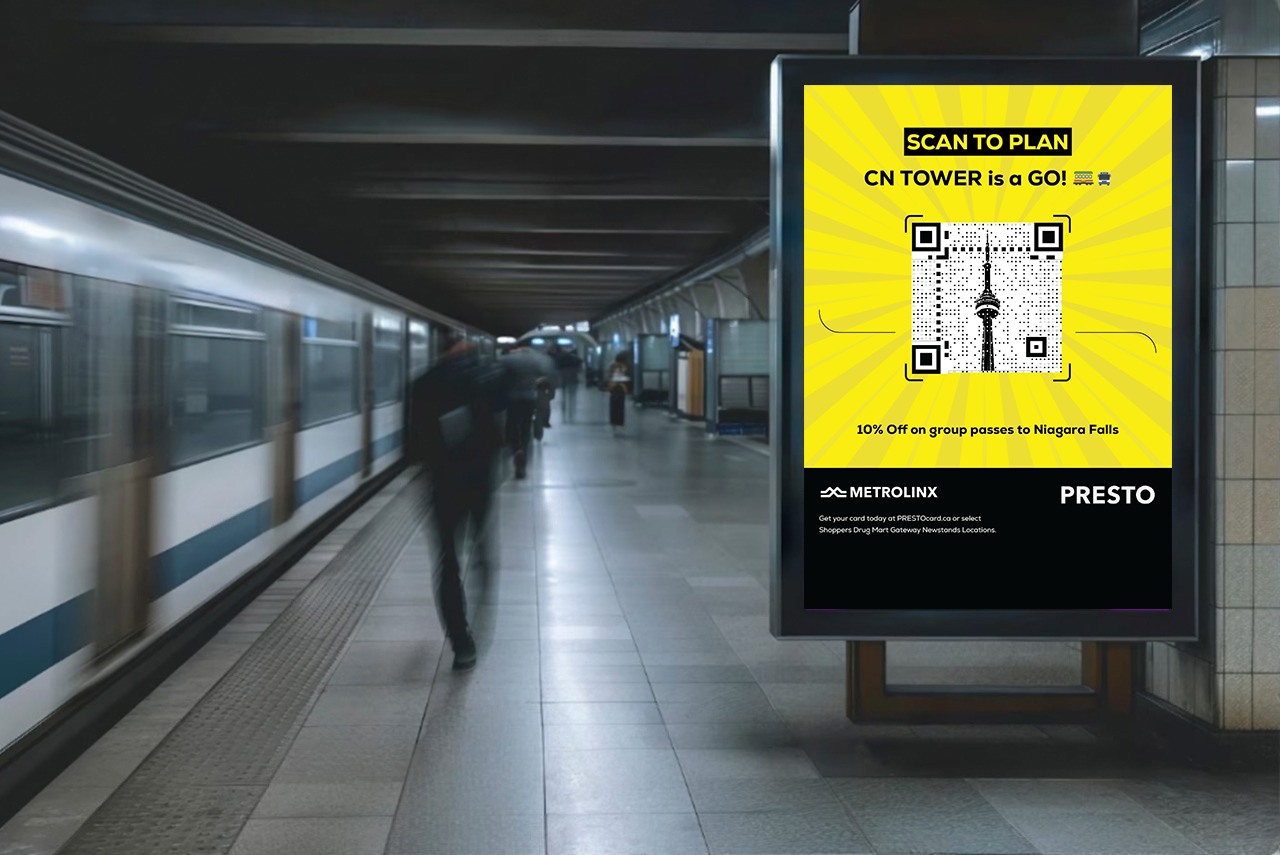 Metrolinx aimed to highlight must-visit locations for newcomers to explore the city. Working closely with the copywriter, we developed the core ideas and visual direction together. I created the key visuals using halftone textures, QR elements, and Photoshop–Illustrator workflows. The result was a functional, vibrant creative communication that encouraged discovery and engagement.